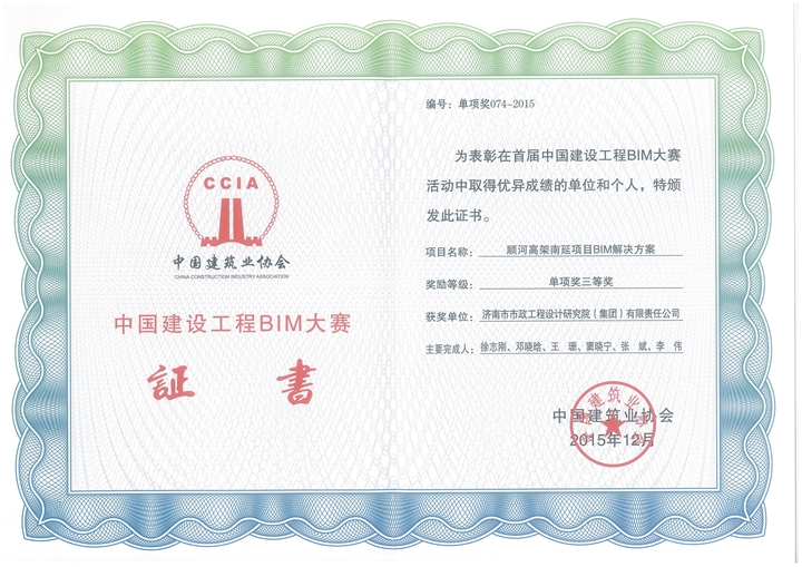 12月29日,首屆中國建設(shè)工程BIM大賽頒獎暨表彰大會在海口舉行,集團(tuán)兩項(xiàng)成果獲獎,其中“BIM技術(shù)在濟(jì)南市唐冶新區(qū)市政工程中的應(yīng)用”獲得二等獎,“順河高架南延項(xiàng)目BIM解決方案”獲得三等獎;另外,“BIM技術(shù)在分離式立交工程中的應(yīng)用——青島長江路與昆侖山路立交”得到書面表彰。