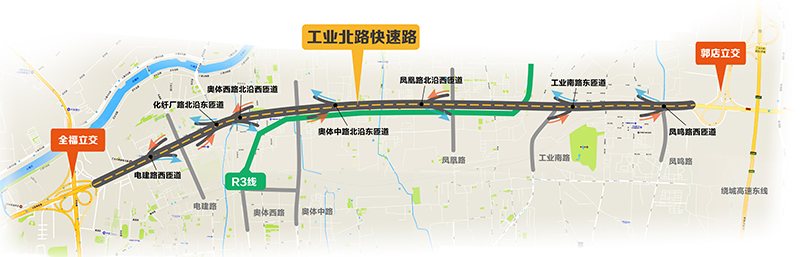 工業(yè)北路快速路西起全福立交橋,東至郭店立交,長(zhǎng)13.6公里,標(biāo)準(zhǔn)段寬25.5米,雙向6車(chē)道。沿線(xiàn)共設(shè)置8對(duì)匝道,其中7對(duì)實(shí)現(xiàn)高架橋梁與地面道路的連接,在郭店立交設(shè)置一對(duì)專(zhuān)用匝道實(shí)現(xiàn)高快轉(zhuǎn)換。