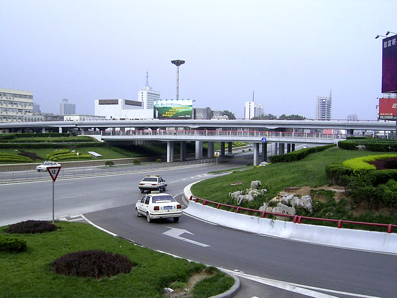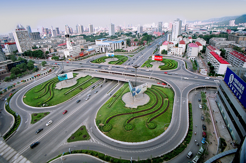 為苜蓿葉形三層互通式立交,兩條主干路均寬 50 米,橋梁上部采用簡支箱梁,寬腹 T 梁及三孔連續(xù)板結(jié)構(gòu),預制安裝,施工簡單;下部蓋梁為暗藏式,墩身采用蝙蝠式柱,外形美觀;基礎為鋼筋砼擴大基礎及灌注樁;該立交充分利用原有排水系統(tǒng),雨污水完全自流,經(jīng)濟合理。榮獲市長金杯獎,被評為泉城十大景觀之首。